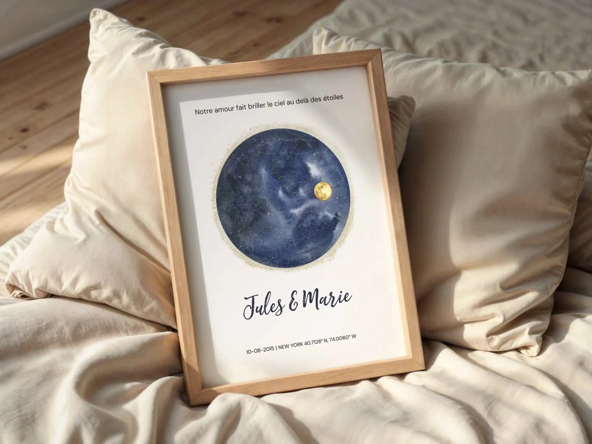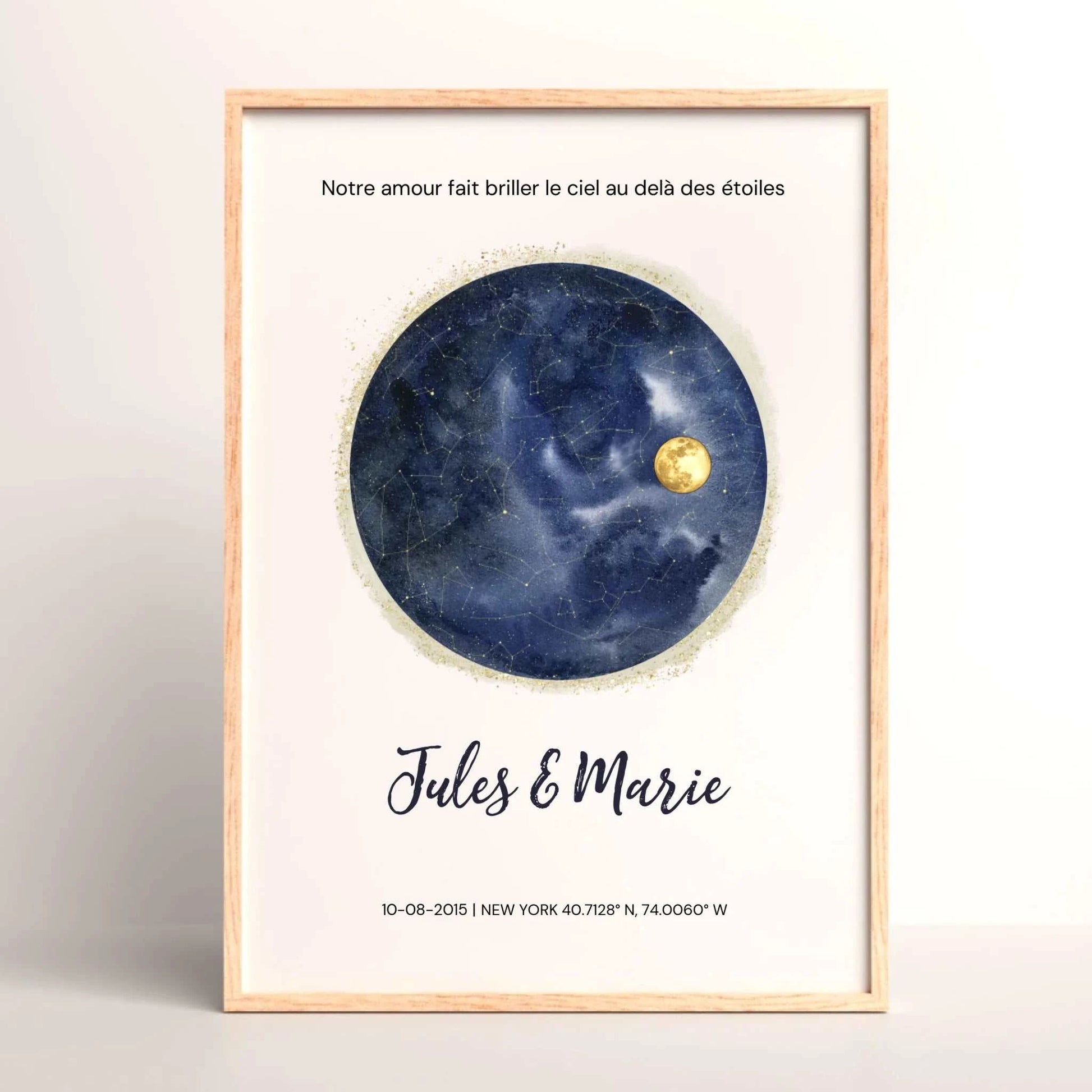 Revivez la magie d’un instant précieux grâce à cette affiche personnalisée du ciel étoilé. À partir de la date et du lieu de votre choix, nous générons avec précision la carte des constellations et la phase de la lune telles qu’elles étaient à ce moment-là. Un cadeau romantique, symbolique et unique.