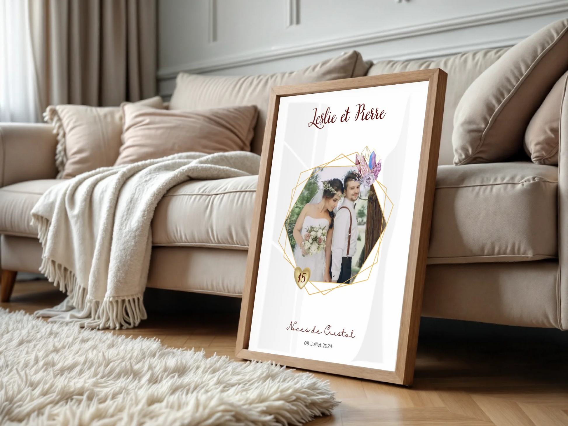 Célébrez 15 ans d’amour avec l’affiche personnalisée Noces de Cristal ! Sublimez vos souvenirs avec ce design élégant mêlant photo, géométrie dorée, et touches de cristaux roses et violets. Parfait pour commémorer cette étape précieuse de votre vie de couple, cet hommage unique capture la beauté et l’intemporalité de votre union.