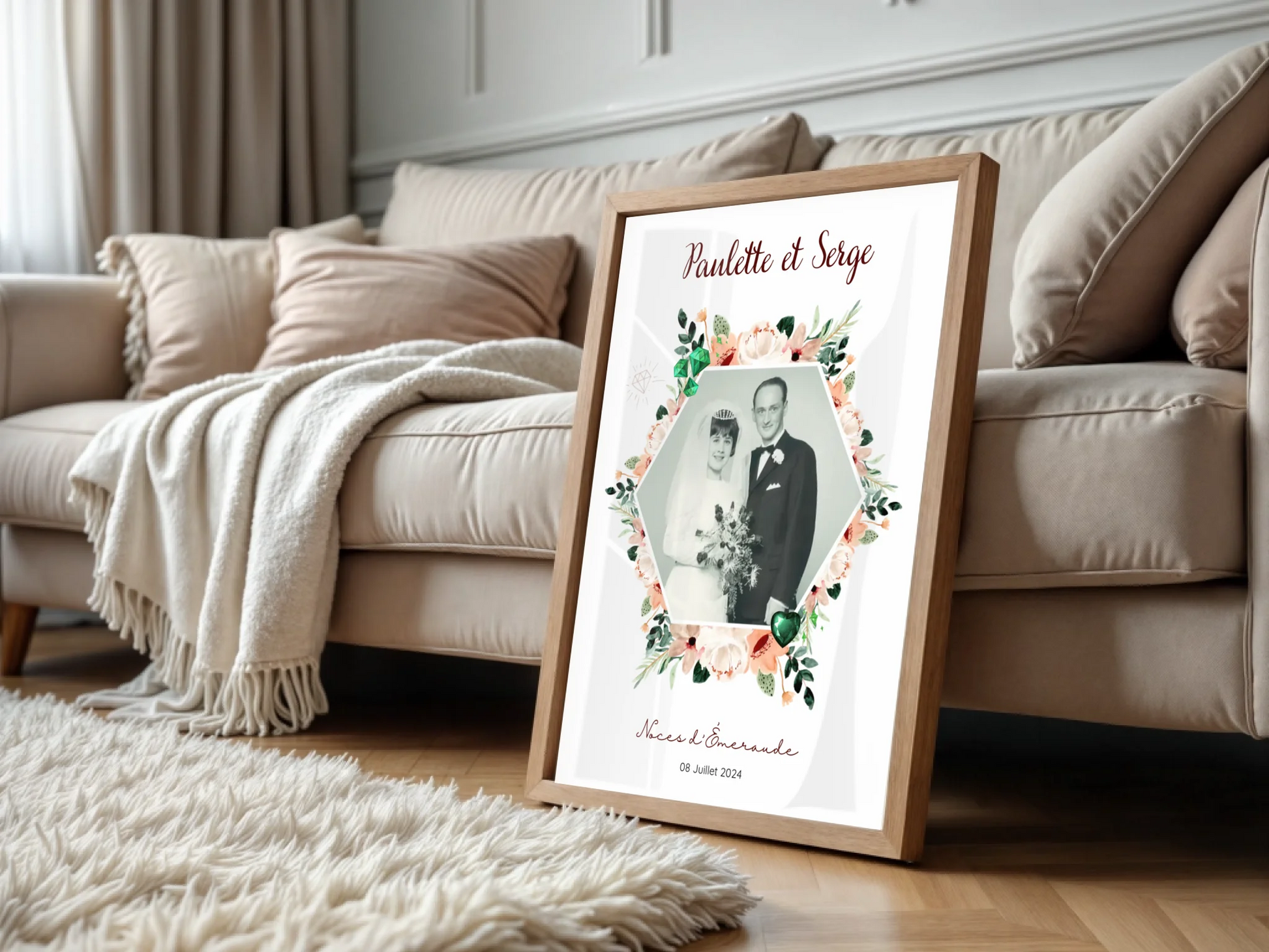 L'émeraude, pierre précieuse d'un vert profond, symbolise la longévité et la prospérité d'un couple. Offrir une affiche personnalisée "Noces d'Émeraude" est une façon de célébrer la force de votre amour et de rendre hommage à toutes ces années passées ensemble.